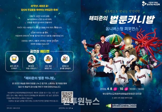 (원투원뉴스) 부산광역시교육청학생예술문화회관은 오는 8일부터 10일까지 학생예술문화회관 대극장에서 초·중·고 학생 2,400여 명을 대상으로 ‘해피준의 벌룬카니발’ 공연을 개최한다.