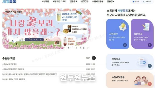 2023년 7월 서비스를 시작해 지난 3월 회원 20만 명을 돌파한 시민 참여 플랫폼 새빛톡톡은 ‘성공한 공공플랫폼’의 본보기로 자리매김하며 ‘시민이 만드는 도시 수원’의 동력이 되고 있다.