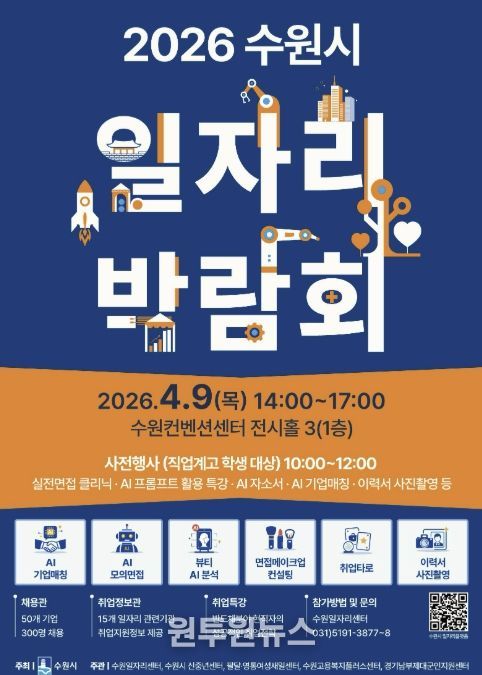 (원투원뉴스) 수원특례시는 9일 오후 2시부터 5시까지 수원컨벤션센터 전시홀에서 ‘2026 수원시 일자리박람회’를 개최한다.