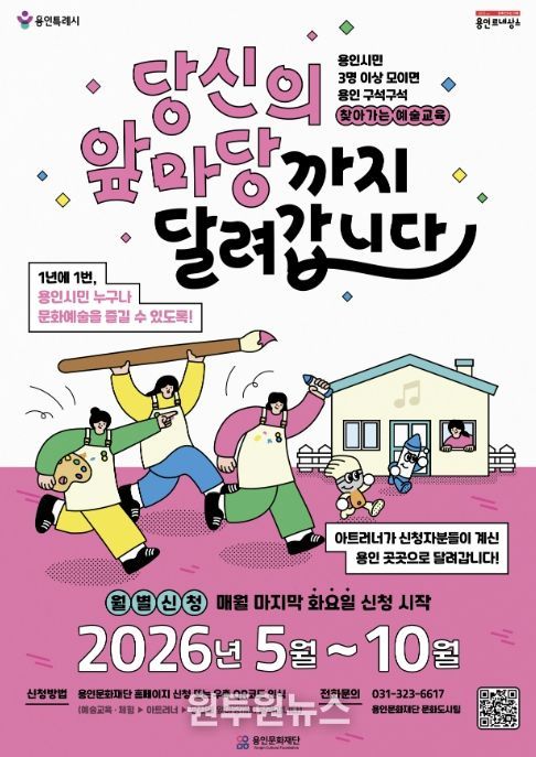 (원투원뉴스) 용인문화재단은 시민이 원하는 시간과 장소로 직접 찾아가는 2026 찾아가는 예술교육 '당신의 앞마당까지 달려갑니다'의 참여자를 오는 4월 7일부터 모집한다.