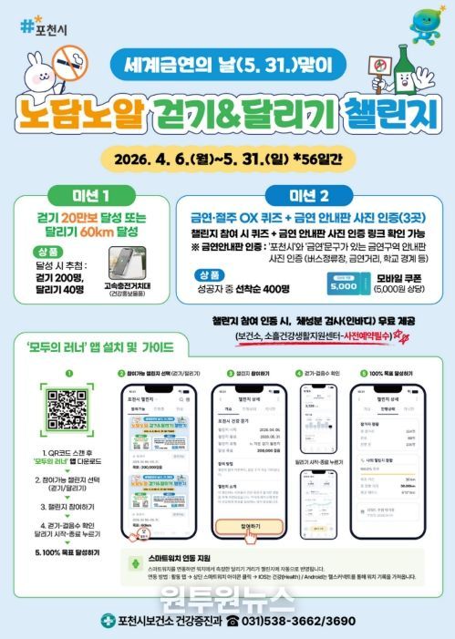 (원투원뉴스) 포천시보건소는 세계 금연의 날(5월 31일)을 맞아 ‘노담노알(금연·절주) 걷기·달리기 챌린지’를 운영한다.