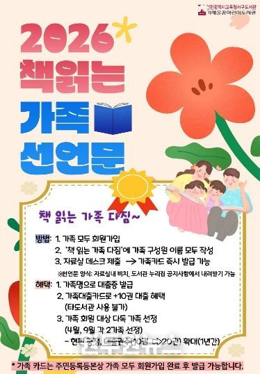 (원투원뉴스) 인천광역시교육청서구도서관은 가족의 독서 활동을 지원하고 책 읽는 사회 분위기 조성을 위해 ‘책 읽는 가족’ 다짐 선언문 참여할 가족을 모집한다.