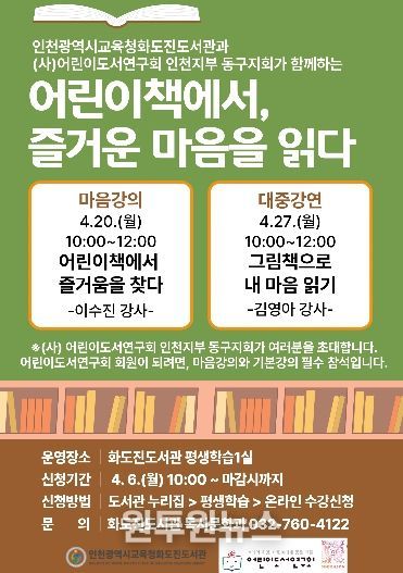 (원투원뉴스) 인천광역시교육청화도진도서관은 (사)어린이도서연구회 인천지부 동구지회와 협력하여 ‘어린이책에서, 즐거운 마음을 읽다’프로그램을 운영한다.