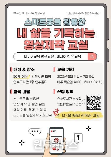 (원투원뉴스) 인천광역시교육청연수도서관은 시민들의 미디어 창작 활동 지원을 위해 2026년 미디어교육 평생교실 ‘내 삶을 기록하는 영상제작 교실’을 운영한다.
