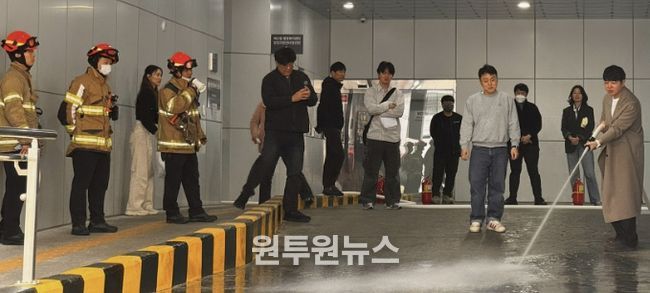 훈련은 화재 발생 시 행동 요령 교육을 시작으로 ▲연기 발생 상황을 가정한 대피 훈련 ▲교육용 소화기 사용 실습 ▲옥내 소화전 살수 실습 순으로 진행됐으며, 참가자들은 실제 화재 상황에 대비한 대응 능력을 체득했다.