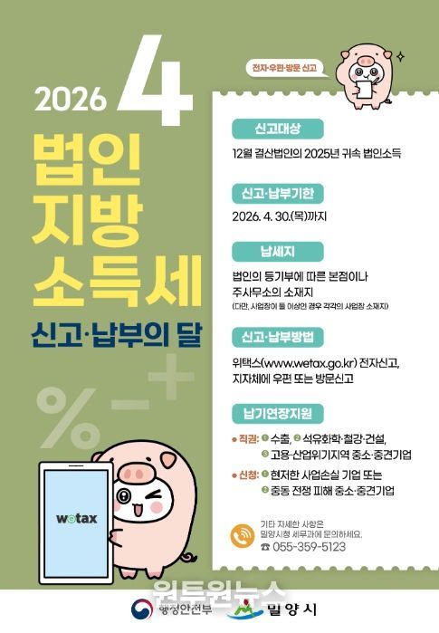 (원투원뉴스) 경남 밀양시는 관내 사업장을 둔 2025년 12월 결산법인을 대상으로 오는 4월 30일까지 법인지방소득세를 신고·납부해야 한다고 밝혔다.