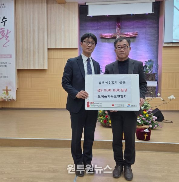(원투원뉴스) 도계기독교연합회(대표 김영국)는 4월 5일 오후 7시 부활절 도계기독교연합예배에서 신도들이 십시일반으로 모은 이웃돕기 성금 200만 원을 기탁하고 전달식을 가졌다. 성금은 지난해에 이어 올해도 도계읍에 거주하는 어려운 이웃들에게 따뜻한 마음과 함께 전달될 예정이다.