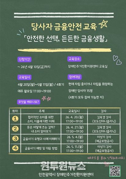 (원투원뉴스) 인천시사회서비스원 소속 인천시장애인주거전환지원센터는 당사자 금융 안전교육 ‘안전한 선택, 든든한 금융 생활’ 참가자를 모집한다고 6일 밝혔다.