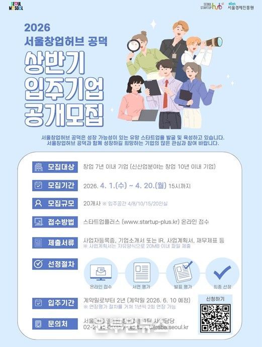 아울러, ‘서울창업허브 성수’에서도 상반기 입주기업 5개사를 모집한다. 성수 허브는 Age-Tech, IT, 문화콘텐츠 등 미래 전략산업 분야를 중심으로 유망 스타트업을 선발하며, 4월 23일까지 접수를 진행한다.