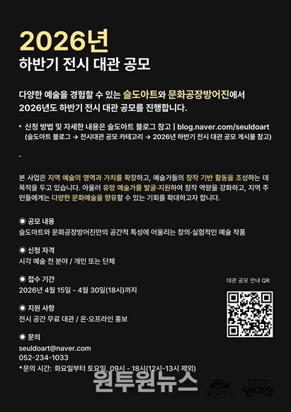 (원투원뉴스) 울산 동구의 복합문화공간 슬도아트와 문화공장 방어진이 오는 4월 15일부터 4월 30일까지 ‘2026년 하반기 전시 대관 공모 사업’ 참여자를 모집한다.