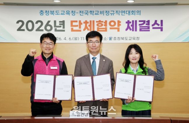 (원투원뉴스) 충청북도교육청과 전국학교비정규직연대회의'전국공공운수노조 전국교육공무직본부, 전국학교비정규직노동조합'는 6일, 충북교육청 회의실에서 2026년 단체협약을 체결했다.