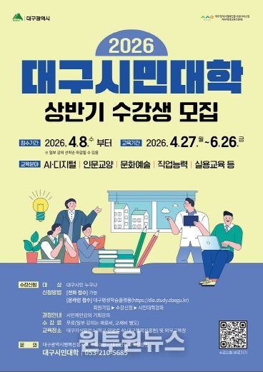 (원투원뉴스) 대구광역시는 시민의 평생학습 기회를 확대하고 변화하는 학습 수요를 반영해 4월 8일부터 ‘2026년 상반기 대구시민대학’ 수강생을 모집한다.