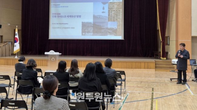 (원투원뉴스) 안동시는 교육발전특구 시범사업의 일환으로, 3월 25일 안동 복주초등학교에서 학부모를 대상으로 ‘아이와 함께 안동 유네스코 세계유산 탐방’을 주제로 한 인문학 특강을 개최했다고 밝혔다.