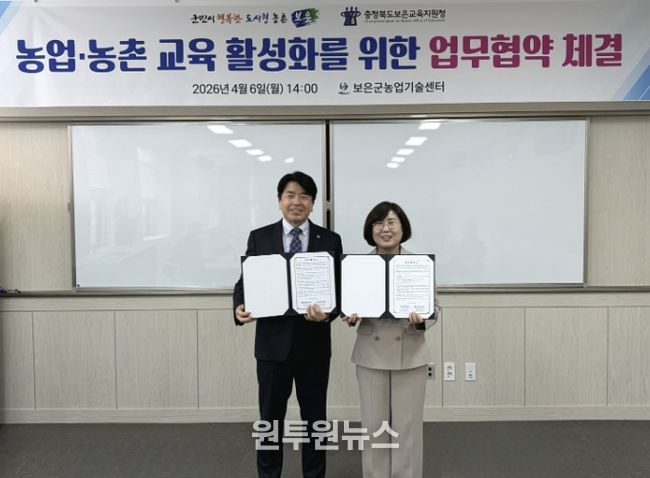 (원투원뉴스) 보은군농업기술센터는 충청북도보은교육지원청과 농업·농촌 교육 활성화를 위한 업무협약을 체결했다고 7일 밝혔다.