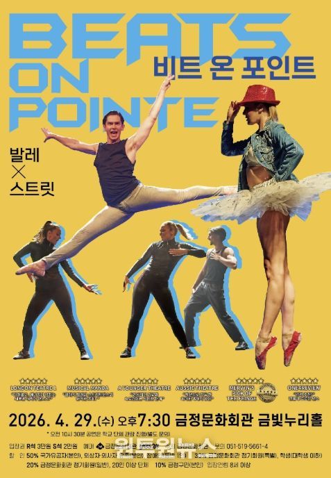(원투원뉴스) 부산 금정구 금정문화회관은 오는 4월 29일 오후 7시 30분, 금정문화회관 금빛누리홀에서 클래식 발레와 스트릿 댄스를 결합한 융복합 퍼포먼스 ‘비트 온 포인트(BEATS on POINTE)’를 개최한다고 밝혔다.