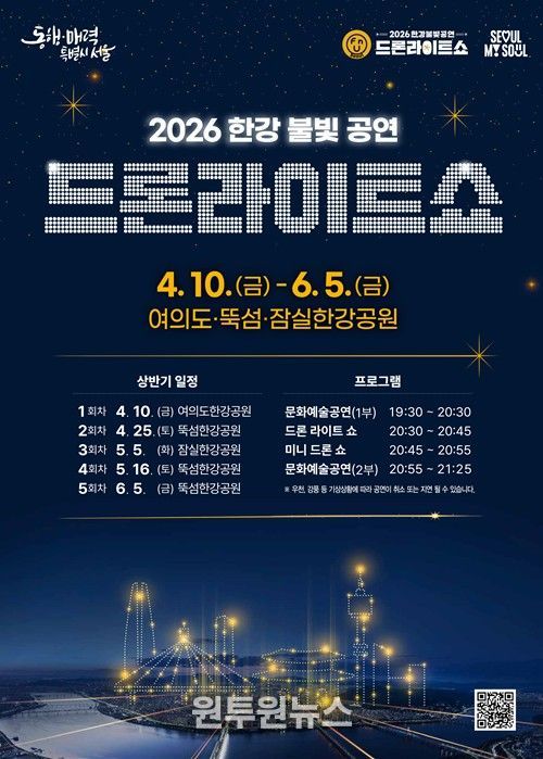 서울시는 4월 10일부터 6월 5일까지 여의도·뚝섬·잠실 한강공원에서 ‘2026 한강 불빛 공연(드론 라이트 쇼)’를 선보인다.