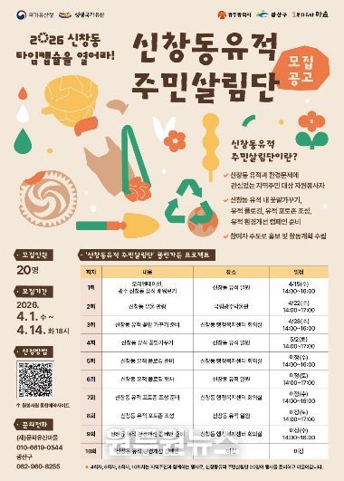 광산구는 ‘신창동 유적 주민살림단’ 클린가든 프로젝트에 참여할 주민 20명을 선착순 모집한다.