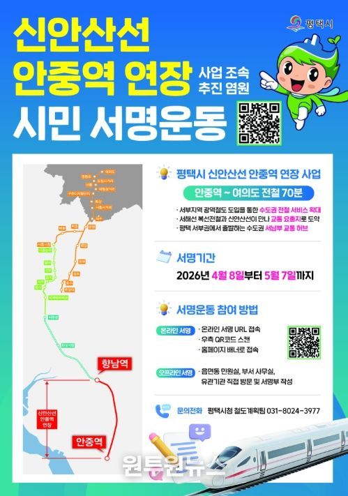 평택시 관계자는 “신안산선 안중 연장은 단순한 교통 개선을 넘어 서부지역 발전의 핵심 기반이 될 것”이라며 “많은 시민이 서명운동에 동참해 지역의 목소리가 정책에 반영될 수 있도록 힘을 모아주시길 바란다”라고 말했다.