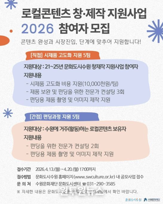 (원투원뉴스) 수원문화재단은 오는 20일까지 지역 고유의 문화자원을 활용한 로컬콘텐츠 발굴과 창작자 육성을 위해 ‘2026 로컬콘텐츠 창·제작 지원사업’을 함께할 참여자를 모집한다.