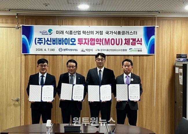 (원투원뉴스) 전북특별자치도는 7일 익산시, 한국식품산업클러스터진흥원과 함께 건강기능식품 제조기업 ㈜신비바이오와 국가식품클러스터 투자협약을 체결했다.