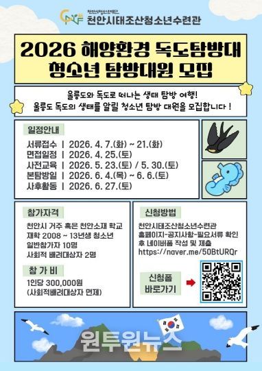 (원투원뉴스) 천안시청소년재단 산하 천안시태조산청소년수련관은 지역 청소년을 대상으로 ‘2026 해양환경 독도탐방대’ 참가자를 모집한다고 7일 밝혔다.