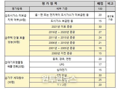 심사는 기후부 지침에 따른 우선 지원 기준을 반영해 평가항목별 배점을 합산한 후 고득점순으로 선정한다. 우선 지원 기준은 대기오염물질을 많이 배출하는 보일러 사용가구, 단열 효율이 높은 가구, 도시가스 미공급 지역 가구, 취약계층 가구이다. 탈락 가구는 예비 대상자로 등록해 결원 발생 시 순위에 따라 선정된다.