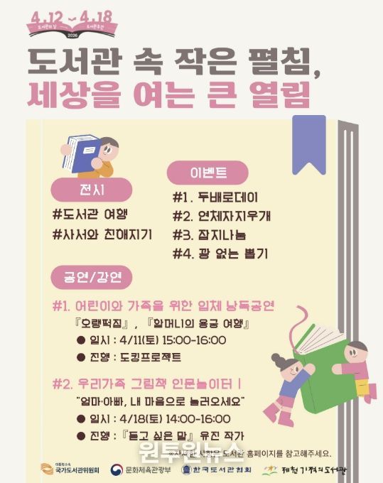 (원투원뉴스) 제천기적의도서관은 제62회 도서관주간을 기념해 오는 4월 11일부터 19일까지 어린이와 가족이 함께 즐길 수 있는 다채로운 독서문화 프로그램과 이벤트를 운영한다.
