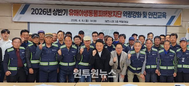 (원투원뉴스) 제천시는 지난 4일 시청 박달재실에서 유해야생동물 피해방지단과 시청, 야생생물관리협회, 국민안전교육센터 관계자 등 40여 명이 참석한 가운데 ‘2026년 유해야생동물 피해방지단 역량 강화 및 안전교육’을 실시했다.