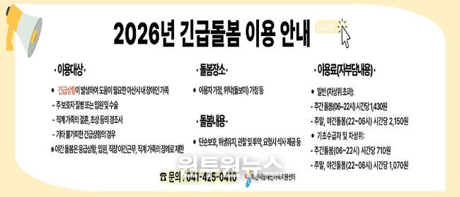 (원투원뉴스) 아산시는 장애인 가족의 돌봄 부담을 경감하고 삶의 질을 향상하기 위해 ‘중증장애인 긴급돌봄서비스’를 추진한다.