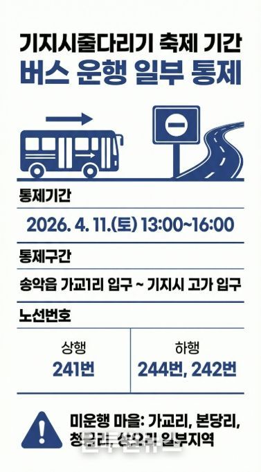 이번 통제는 4월 11일 오후 1시부터 4시까지 3시간 동안 송악읍 가교1리 입구~기지시 고가 입구 구간에서 실시한다. 해당 시간 동안 시내버스 상행 241번, 하행 244번, 242번 노선은 해당 구간을 우회 운행한다.
