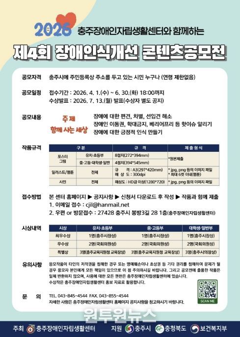 (원투원뉴스) 충주장애인자립생활센터는 제46회 장애인의 날을 맞아 장애에 대한 사회적 이해와 공감을 높이고, 차별 없는 지역사회를 조성하기 위한 ‘2026년 장애인식개선 콘텐츠 공모전’을 개최한다.