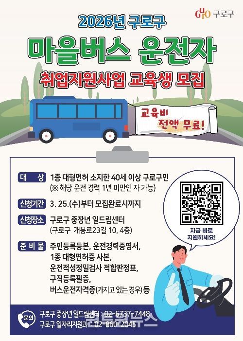 (원투원뉴스) 구로구는 지역 내 마을버스 인력난 해소와 중장년층 일자리 창출을 위해 ‘2026년 마을버스 운전자 취업지원사업’ 참여자를 모집한다고 밝혔다.