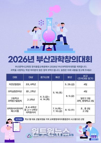 (원투원뉴스) 부산광역시교육청창의융합교육원은 오는 14일까지 과학 분에야 재능과 관심이 있는 부산 지역 초·중·고등학생을 대상으로 ‘2026년 부산과학창의대회’ 참가 신청을 받는다고 8일 밝혔다.