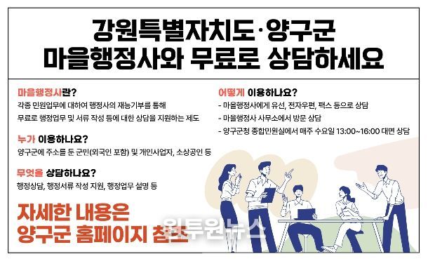 마을행정사는 행정사의 재능기부를 통해 복잡한 행정 업무 및 서류 작성 등에 대해 무료로 상담을 지원하는 제도로, 양구군에 주소를 둔 군민은 물론 외국인, 개인사업자, 소상공인 등 행정 상담이 필요한 사람이라면 누구나 이용할 수 있다.