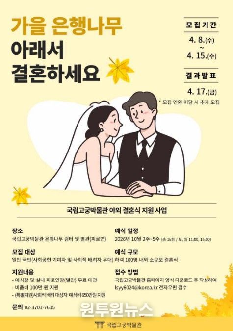 이번 사업은 국립고궁박물관의 가을 명소인 야외 은행나무쉼터를 혼례 장소로 무료 개방해 문화유산 공간에서 특별한 야외 결혼식을 올릴 수 있도록 지원하는 사업이다. 해외 유명 관광지에서 진행되는 야외 혼례처럼 문화유산 공간을 활용한 특별한 결혼식을 제공함으로써 박물관의 관광 명소화에도 기여할 것으로 기대된다.