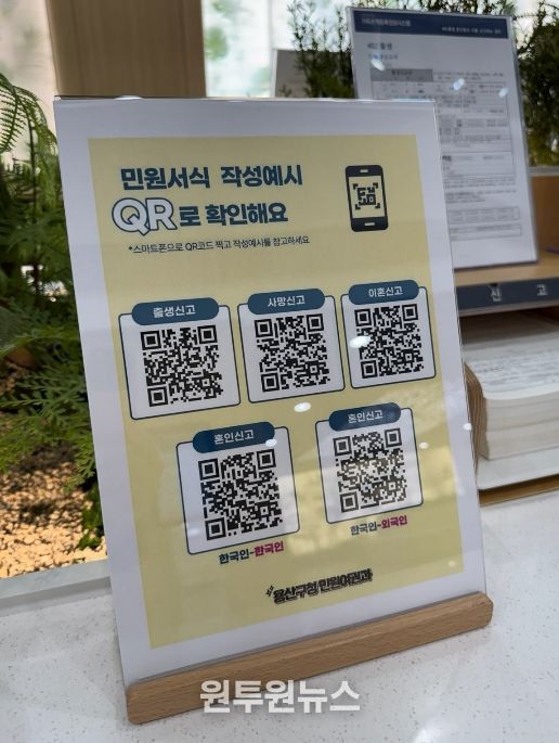 구는 이러한 불편함을 줄이고 작성 어려움을 해소하기 위해 주요 신고서의 작성 예시를 정보무늬(QR코드)로 제작해 구 누리집에 게시하고, 구청 민원실에 비치했다.