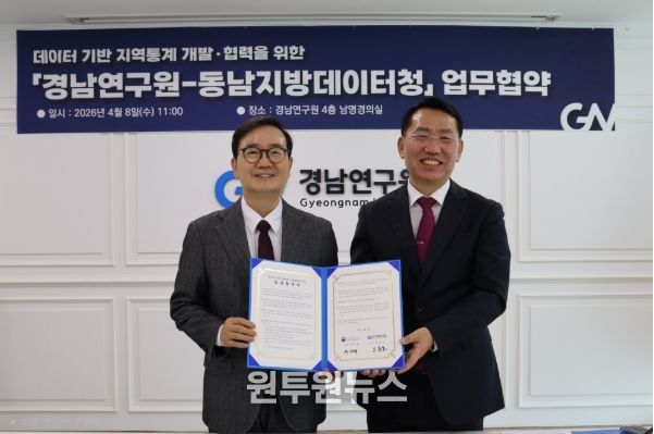 (원투원뉴스) 경남연구원과 동남지방데이터청이 8일 경남연구원 남명경의실에서 ‘데이터 기반 지역통계 개발 및 협력을 위한 업무협약’을 체결하고 데이터 기반 정책 연구 협력을 본격화하기로 했다.