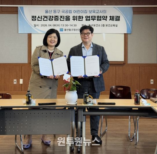 (원투원뉴스) 울산동구정신건강복지센터는 4월 8일 오후 1시 30분 동구보건소 2층 보건교육실에서 울산 동구 국공립 어린이집연합회와 함께 보육 교사의 정신건강 증진을 위한 업무 협약을 체결했다.