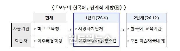 (원투원뉴스) 교육부와 한국교육학술정보원(원장 정제영)은 국정과제 101번 ‘교육격차 해소를 위한 공교육 강화’의 일환으로, 이주배경학생 한국어교육을 위해 운영 중인 '모두의 한국어' 시스템의 사용기관과 학습자 범위를 단계적으로 확대한다고 밝혔다.