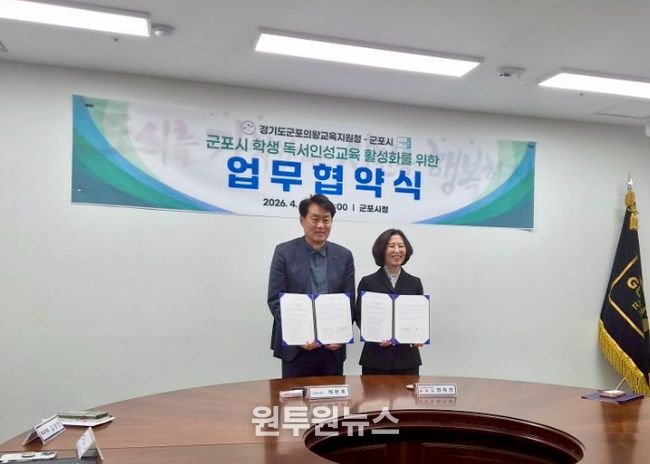 (원투원뉴스) 경기도군포의왕교육지원청과 군포시는 4월 8일 군포시청에서 '지역독서 징검다리'사업 추진을 위한 독서인성교육 활성화 업무협약을 체결했다.