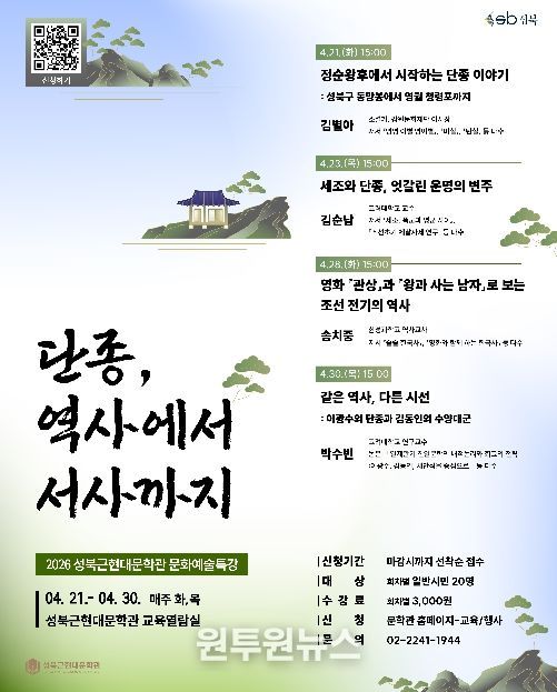 (원투원뉴스) 서울 성북구가 성북근현대문학관 문화예술특강 '단종, 역사에서 서사까지'를 4월 21일부터 30일까지 성북근현대문학관 교육열람실에서 운영한다.