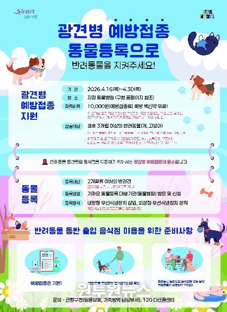 은평구 관계자는 “광견병은 사람에게도 전염될 수 있는 만큼 정기적인 예방접종이 무엇보다 중요하다”며 “반려동물을 키우는 가정에서는 접종 기간 내 반드시 예방접종을 완료해 주시길 바란다”고 당부했다.
