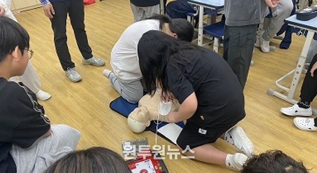 이어 실습 시간에는 ▲학생들이 직접 교육용 마네킹의 가슴을 압박해 보고 ▲교육용 AED를 작동시켜 보는 등 머리로 배운 지식을 몸으로 완벽히 익히는 훈련을 실시한다.