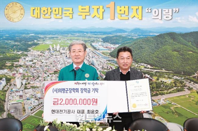 (원투원뉴스) 의령군은 지난 7일 의령읍 소재 현대전기공사(대표 최윤호)가 (사)의령군장학회에 장학금 200만원을 기탁했다고 밝혔다. 이번 기탁은 지역 학생들의 학업 지원과 미래 인재 육성을 위한 취지에서 이루어졌다.