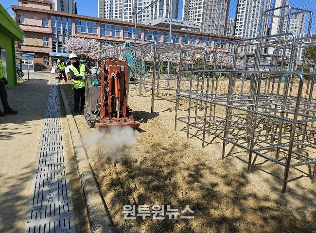 특히 전문 업체에서 놀이기구와 바닥재를 고온·고압의 스팀으로 소독하고 모래 바닥재 기생충(란) 검사도 병행 지원하여 학교 행정업무 부담이 경감될 것으로 기대된다.