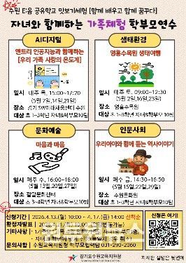 수원교육지원청은 오는 5월 한 달간 관내 초등학생 자녀와 학부모를 대상으로 지역 인프라를 적극 활용한‘2026년 가족체험 학부모연수’인 '공유학교 맛보기 체험:함께 배우고 함께 꿈꾸다'를 운영한다고 밝혔다.