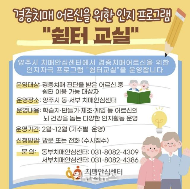 (원투원뉴스) 양주시보건소 치매안심센터가 경증 치매환자의 인지 기능 유지와 중증화 예방을 위해 인지자극 프로그램 ‘쉼터교실’을 운영한다.