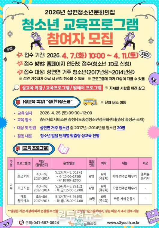 성연면 거주 초등학생(3학년~6학년)이라면 누구나 신청 가능하며, 성연청소년문화의집 홈페이지를 통해 온라인으로 접수할 수 있다.