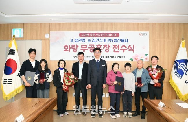(원투원뉴스) 부산 동래구는 지난 8일 6·25전쟁에 참전해 무공을 세운 고(故) 정관영 중위와 고(故) 김건식 병장의 후손에게 각각 은성화랑, 무성화랑 무공훈장을 전달했다고 밝혔다.