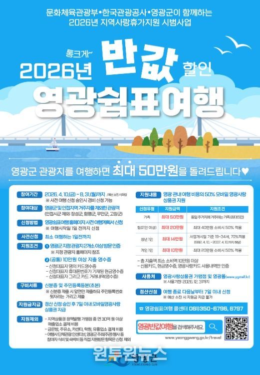 (원투원뉴스) 영광군은 관광객에게 여행경비 반값 혜택을 제공하는 2026년 지역사랑 휴가지원 시범사업 ‘영광 쉼표 여행’의 신청·접수를 4월 10일 오전 9시부터 ‘영광 쉼표 여행’ 누리집을 통해 시작한다고 밝혔다.